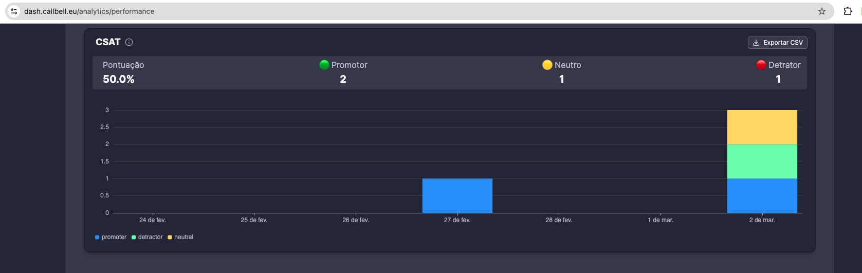 At last, you will be able to see the results of your CSAT survey in the analytics section of the Callbell app (performance tab), as well as the response logs.